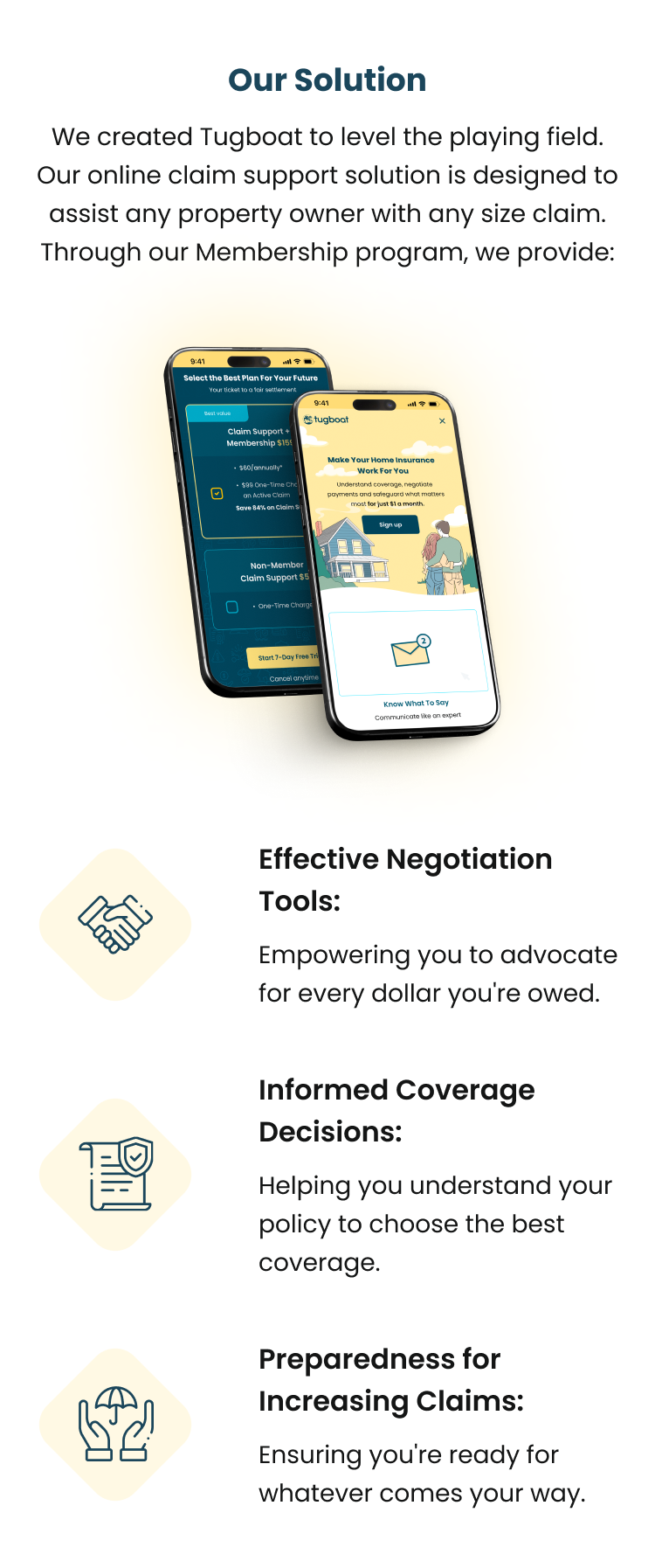 Determined to make a difference, they launched Tugboat in 2021 to provide homeowners with the tools and guidance needed to effectively manage their insurance claims. The impact was greater than they ever expected, with users significantly increasing their settlements and successfully overturning claim denials by knowing the right questions to ask and steps to take.